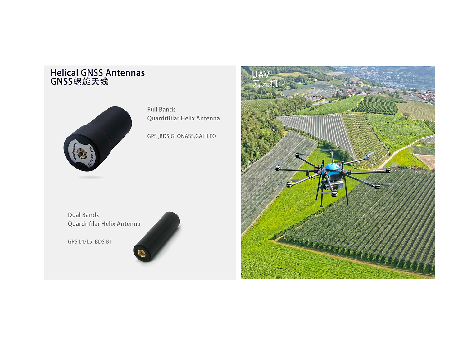 This antenna is a three-system seven-band four-arm helical antenna, covering GPS L1/L2, BDS B1/B2/B3, GLONASS L1/L2, widely used in navigation scheduling, tracking monitoring, measurement and control fields. Especially suitable for UAV and many other applications, such as aerial photography, traffic monitoring, remote telemetry, etc., but also can be used in a variety of handheld terminals, high-precision positioning modules.